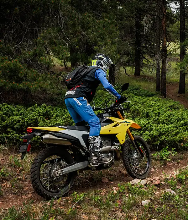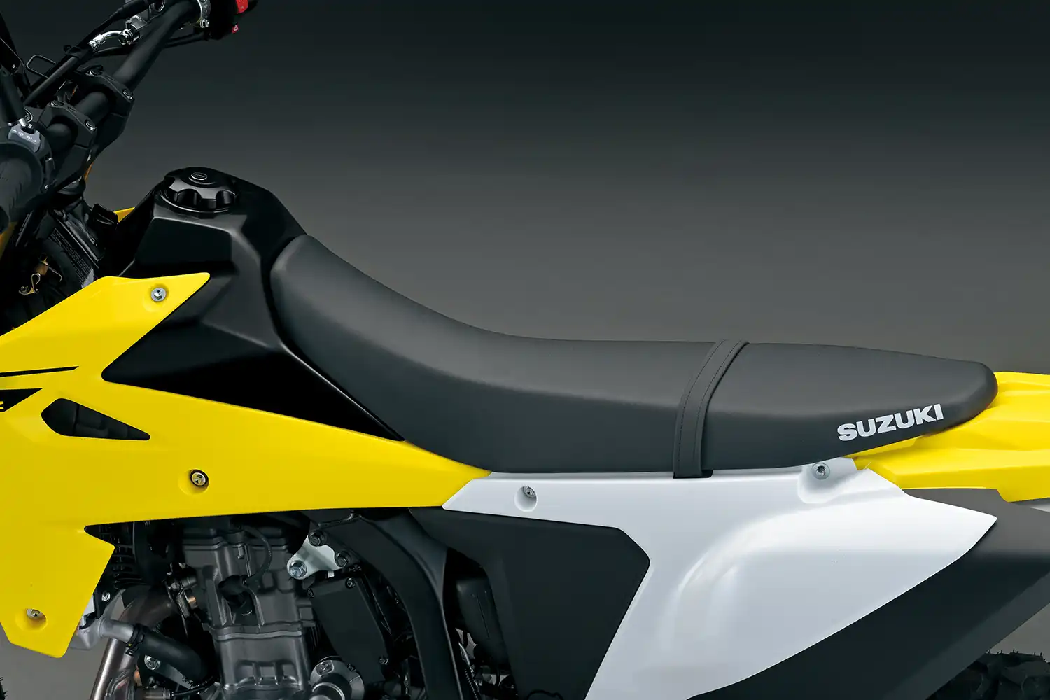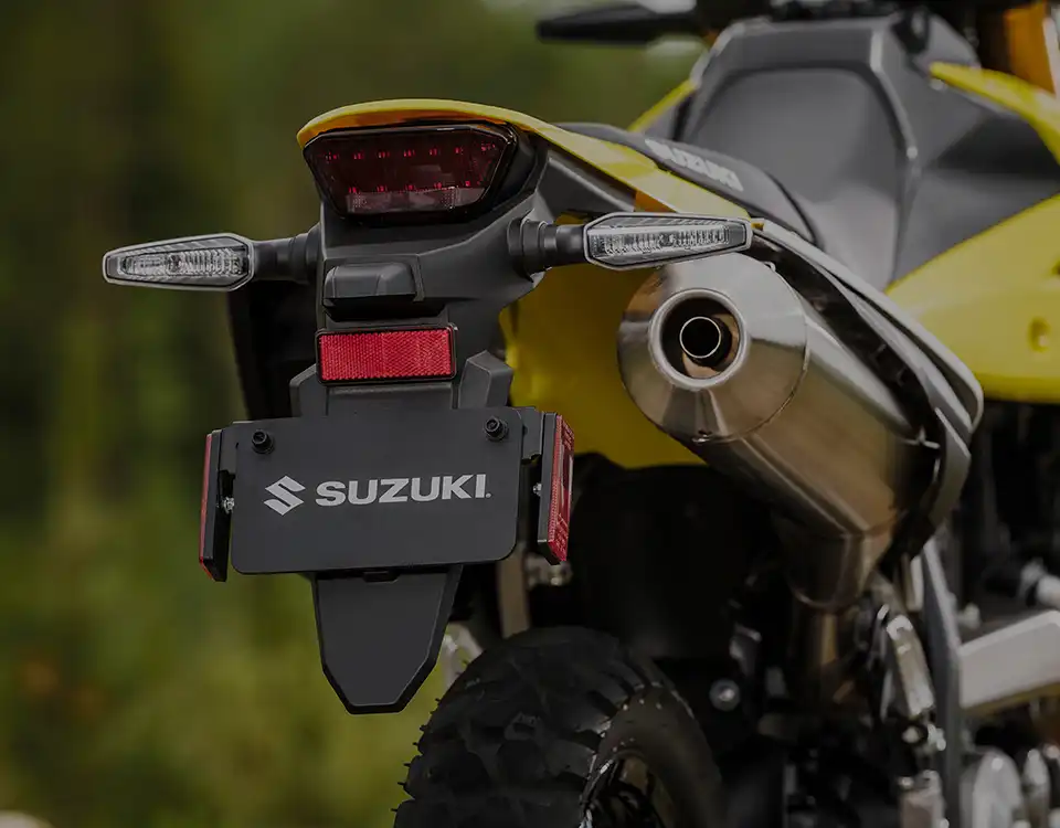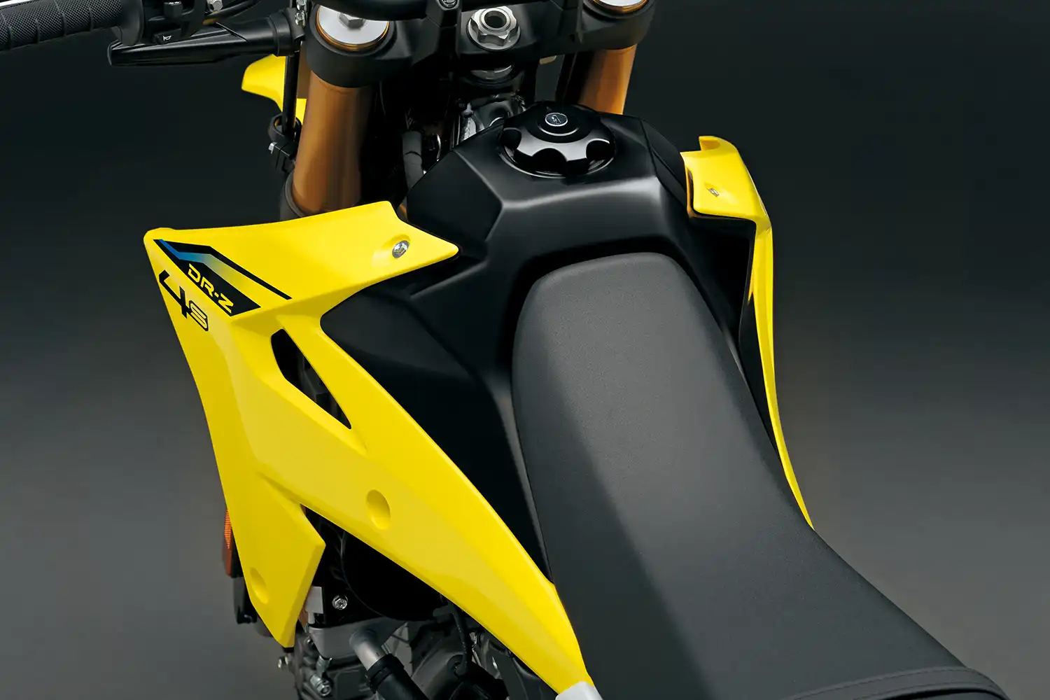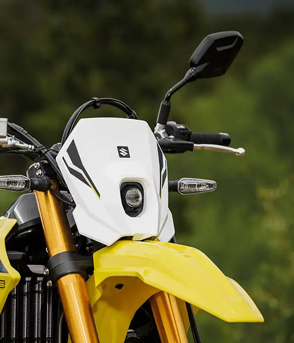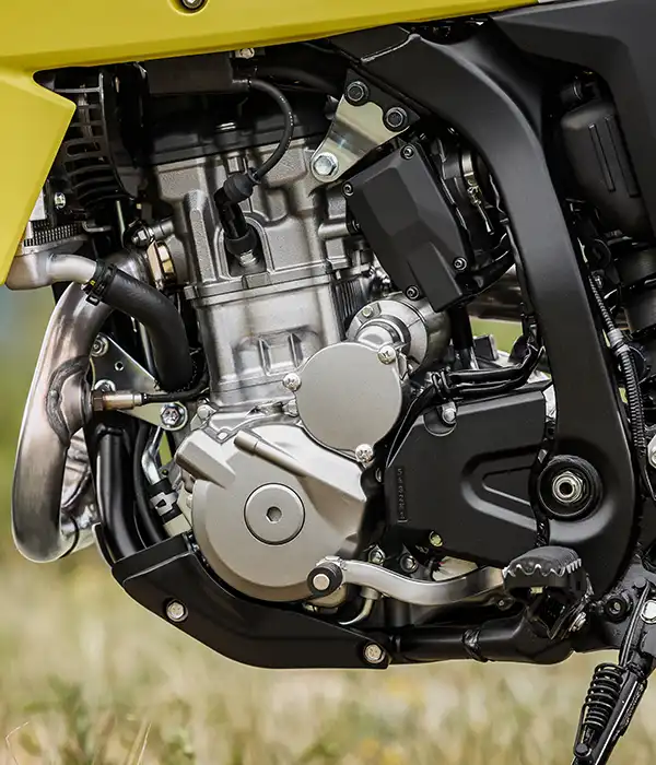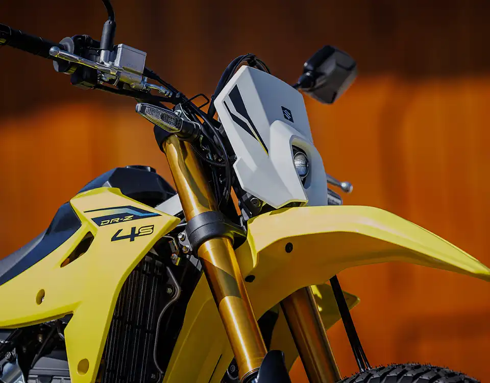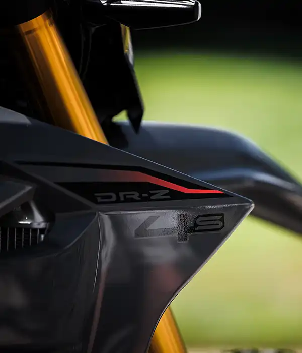 A váz és a kontakt pontok fejlesztése során a hangsúly az irányíthatóságon és a stabilitáson volt. A DR-Z4S esetében ez azt jelenti, hogy a kormányt kissé magasabbra és a vezetőhöz közelebb, a lábtartókat pedig előrébb helyeztük. Ez egy laza, egyenes testhelyzetet eredményez, ami terepen jó irányítást, országúton pedig stabilitást és kényelmet ad.