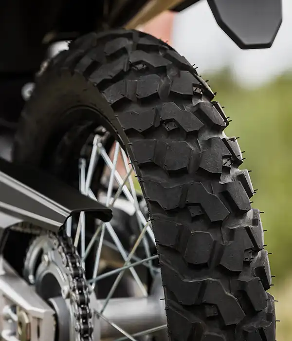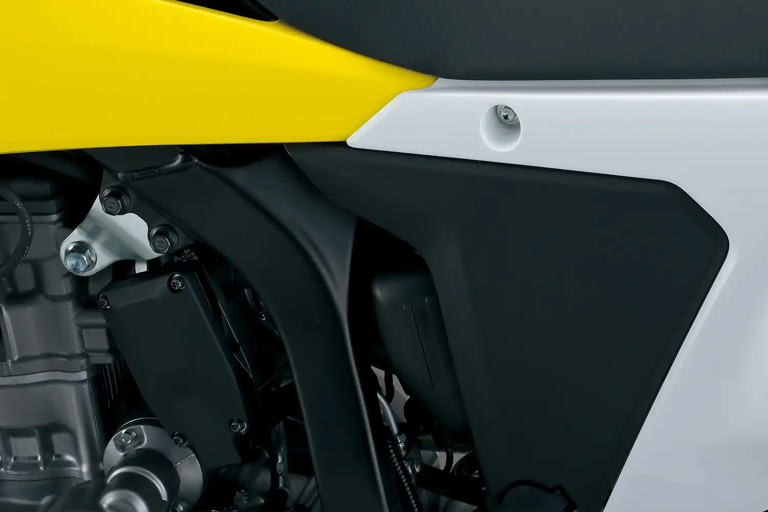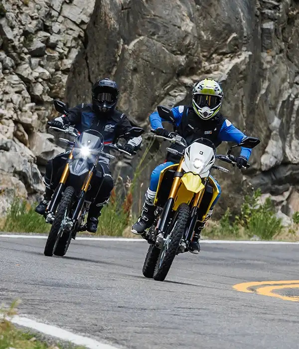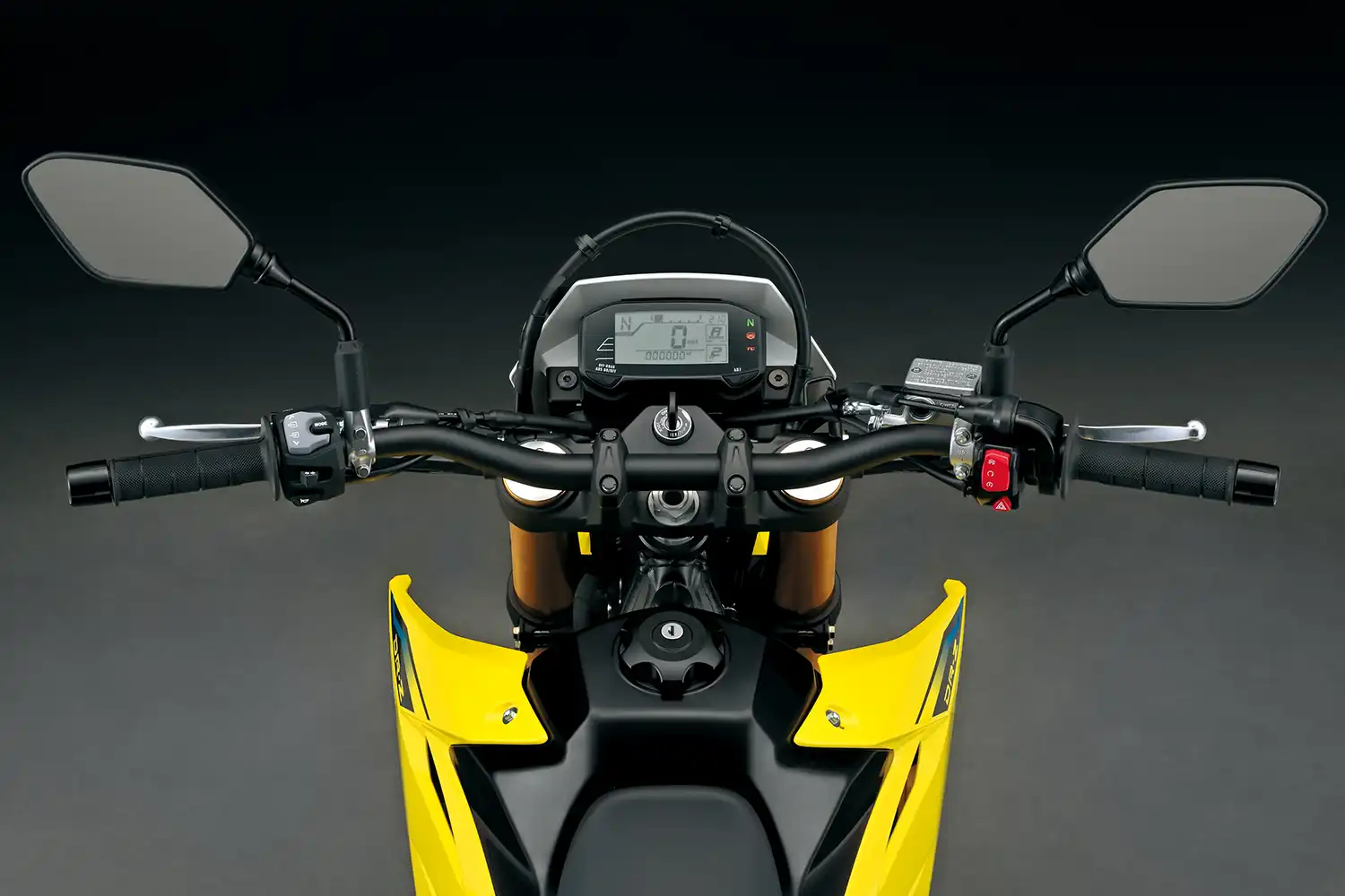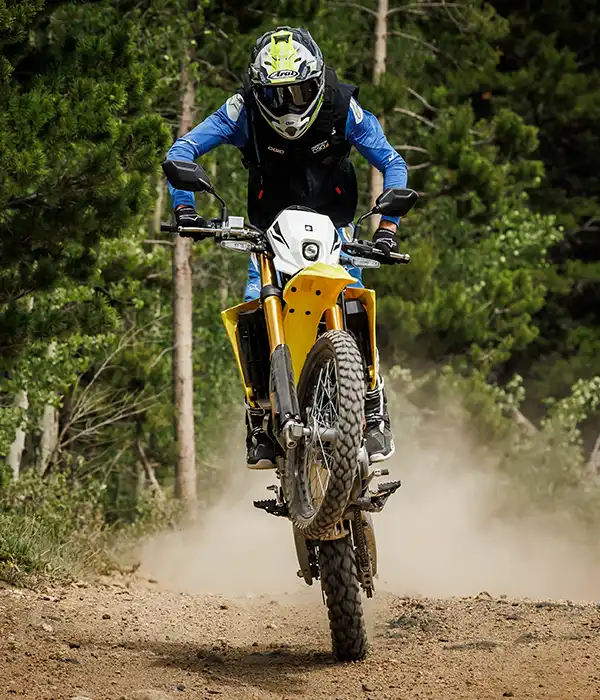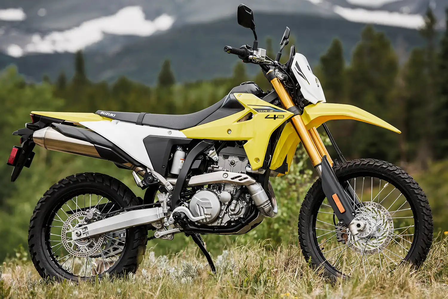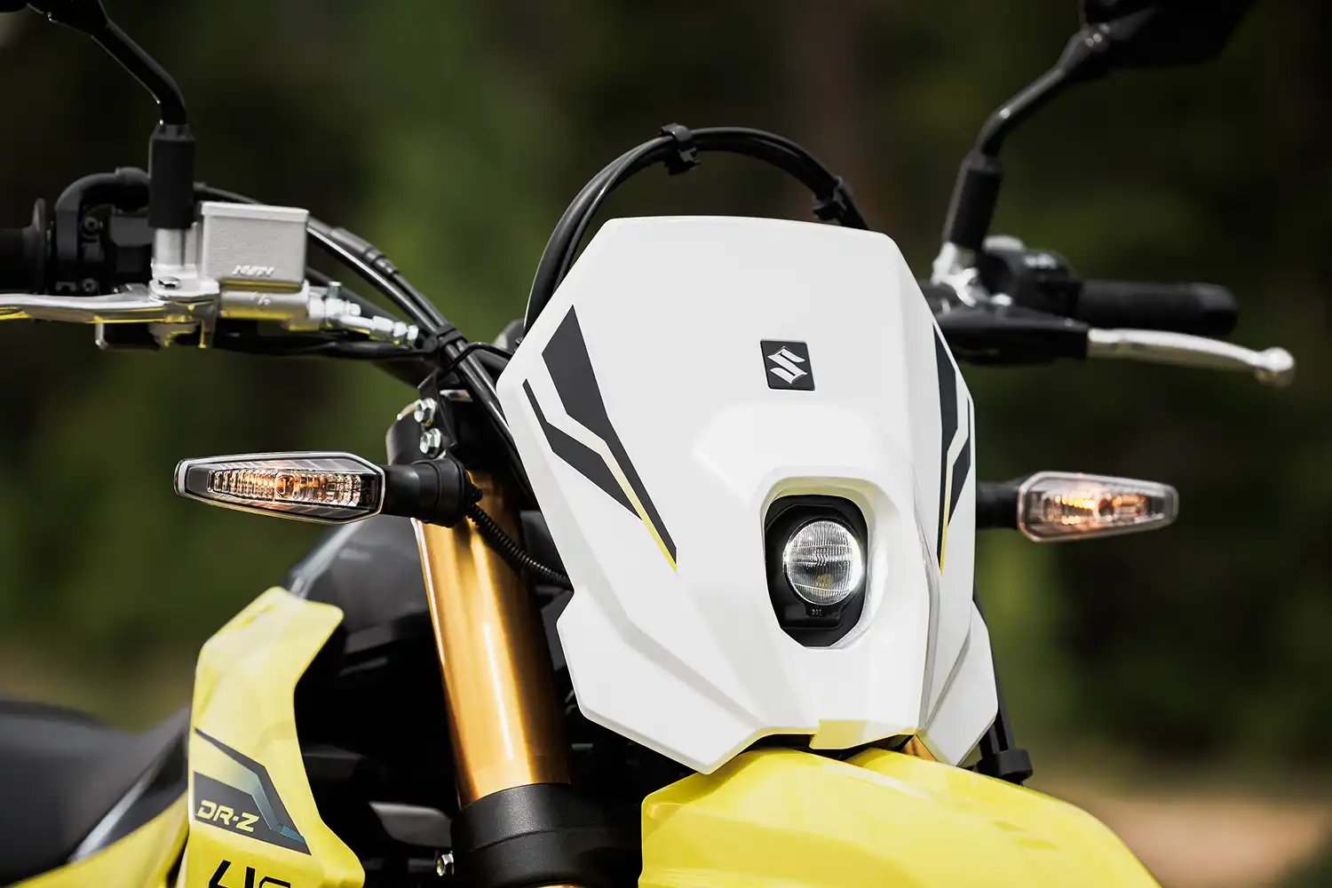 A váz és a kontakt pontok fejlesztése során a hangsúly az irányíthatóságon és a stabilitáson volt. A DR-Z4S esetében ez azt jelenti, hogy a kormányt kissé magasabbra és a vezetőhöz közelebb, a lábtartókat pedig előrébb helyeztük. Ez egy laza, egyenes testhelyzetet eredményez, ami terepen jó irányítást, országúton pedig stabilitást és kényelmet ad.