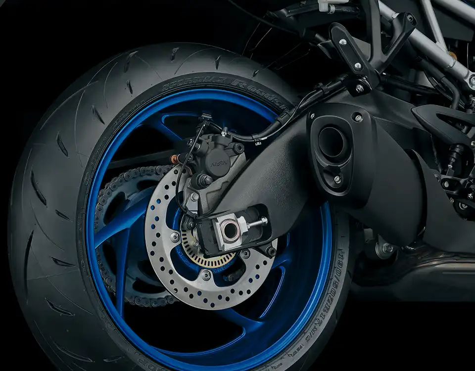 A könnyű, hat küllős öntött alumínium kerekek hozzájárulnak a motor kezelhetőségéhez és a sportos teljesítményhez. A kerekek Dunlop SPORTMAX Roadsport 2 radiál gumiabroncsok legújabb generációjával vannak szerelve (elöl 120/70ZR17, hátul 190/50ZR17). A gondosan megválasztott gumiabroncsokat optimális teljesítmény és biztos tapadás jellemzi. Ennek köszönhetően megfelelnek a GX tömegének és teljesítményjellemzőinek, és az agilitás és stabilitás megfelelő kombinációját nyújtják a motorozás szerelmeseinek. Futófelületi mintázata és anyaga (szilikakeverék) kiváló tapadást biztosít, hozzájárul a motor kezelhetőségéhez, továbbá tartósan kopásálló. Ezek a gumiabroncsok tökéletesen illeszkednek a Suzuki új crossover motorjához.