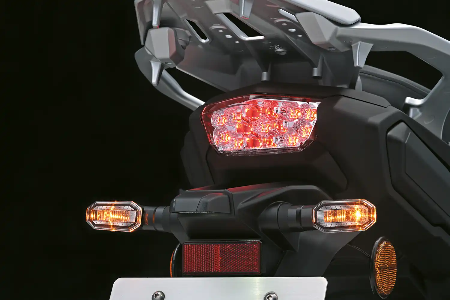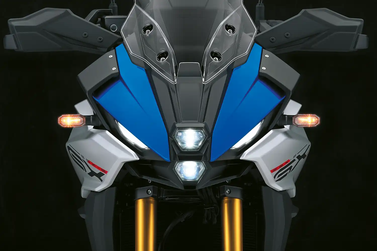 A függőlegesen egymásra helyezett, hatszögletű LED fényszórópár nem csak jó látást biztosít, de a kompakt kialakításnak köszönhetően egyedi, karakteres megjelenést kölcsönöz a motor elejének. A front kialakítás jellegzetes megjelenését a hatszögletű fényszórókat szegélyező, keskeny sávos LED helyzetjelző lámpák emelik ki.