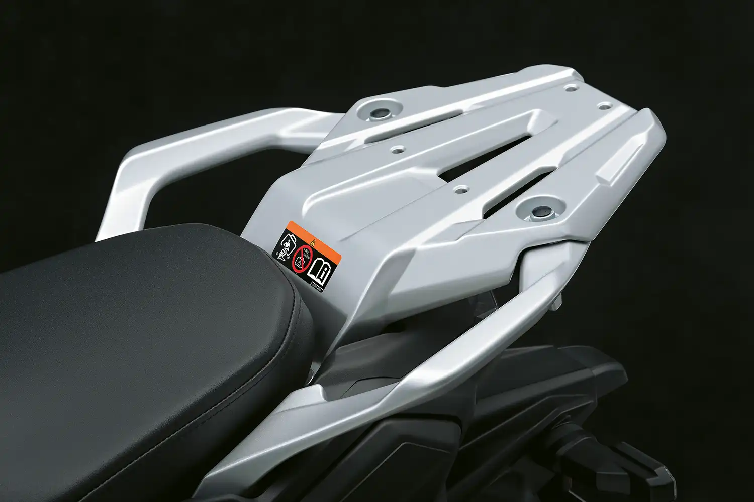 Alapfelszereltségként a GX egy könnyű és praktikus, alumíniumból készült hátsó csomagtartóval van felszerelve. A két oldalon található masszív, integrált kapaszkodórudak biztos fogást biztosítanak a motor utasának. A kapaszkodók kialakításának köszönhetően az oldalsó dobozok felhelyezése és levétele sem okoz gondot. Nem utolsó sorban a motor kialakításakor a Suzuki mérnökei figyelembe vették, hogy a hátsó rész, beleértve a csomagtartót is, egy luxus sportos crossover benyomását keltse.